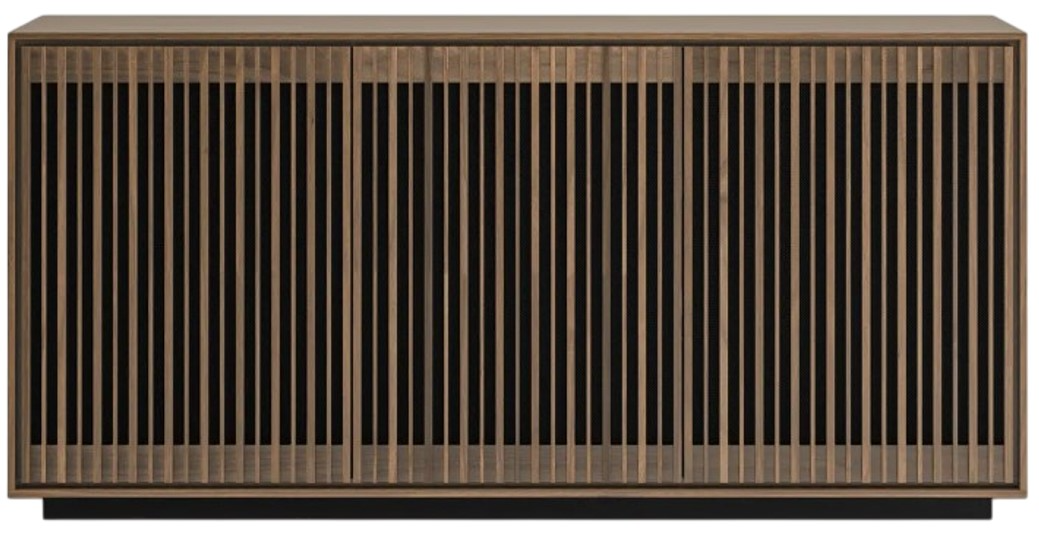 Hardwood slatted doors beautifully conceal contents while providing ventilation, acoustic transparency, and remote control accessibility.