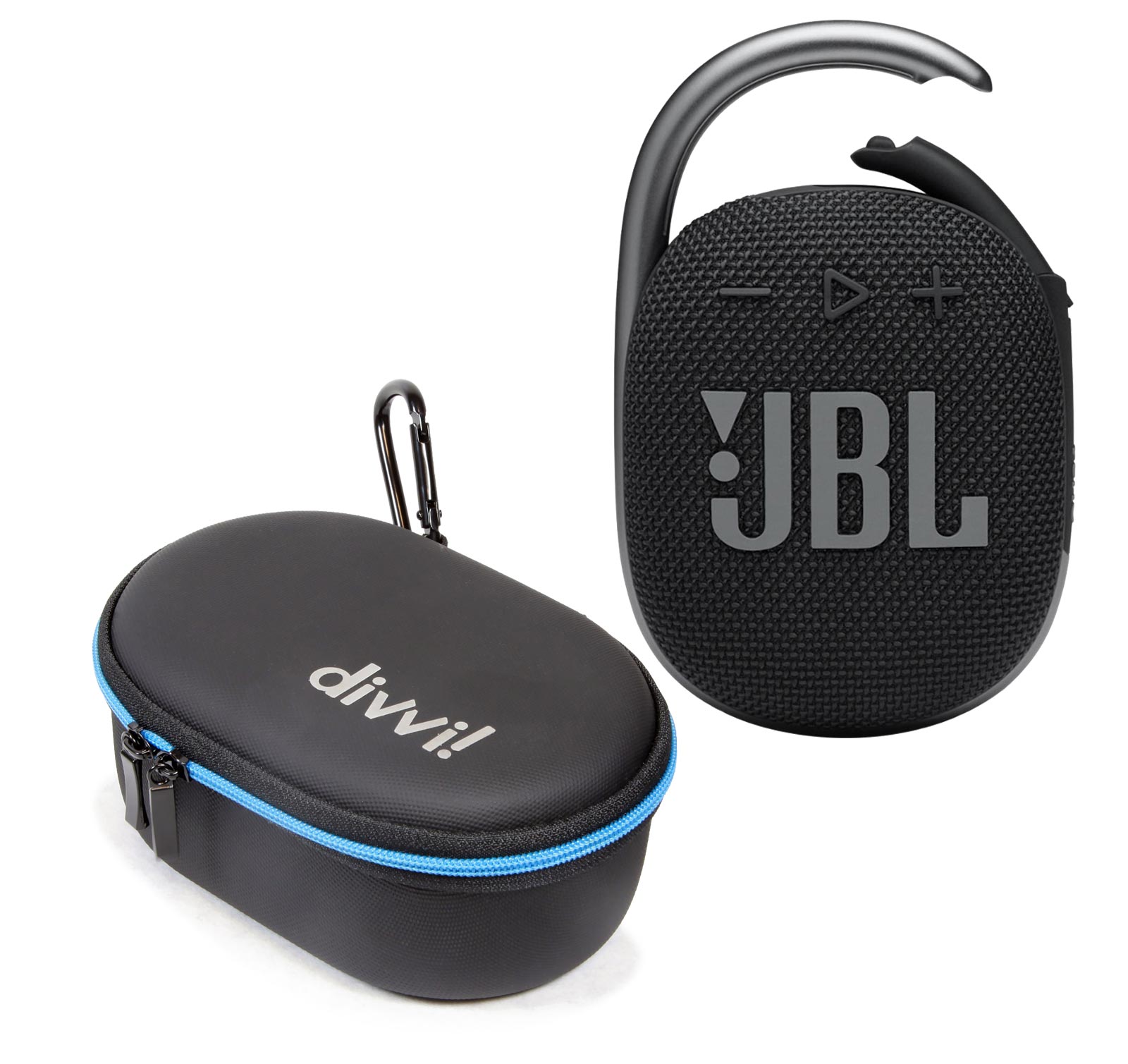 Place your JBL CLIP 4 portable bluetooth within a Protective Hard Case with a rigid structured surface covered in tough nylon. The soft interior protects the speaker with an elastic band that secures the speaker firmly in place. The lid of the case organizes your cables and charger with a mesh pouch with ample space. Attach the protective hard case to a backpack or bag with the convenient carabiner clip. Store your CLIP 4 bluetooth speaker inside, and secure in place with the blue heavy–duty zipper with dual zipper pulls.