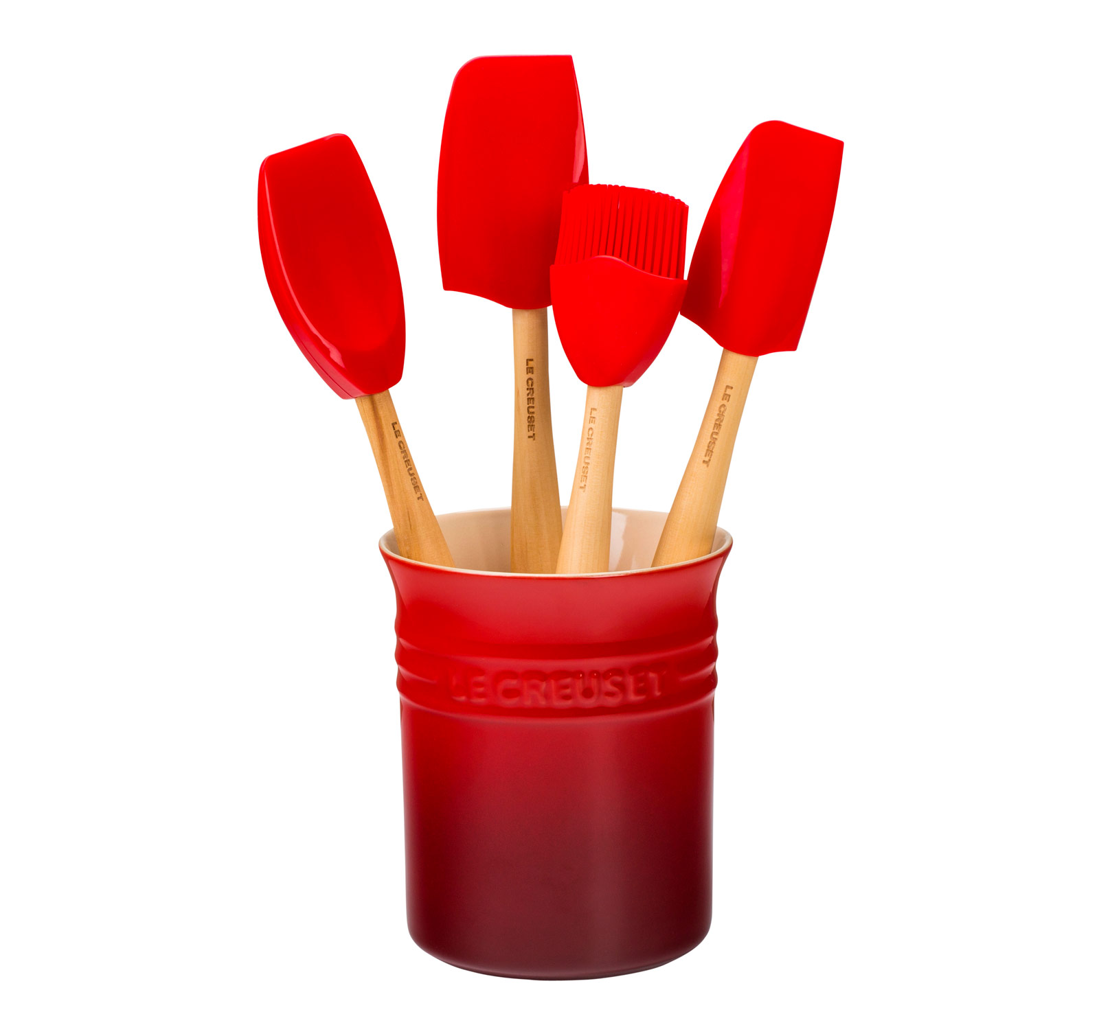 A perfect gift for outfitting a new kitchen or complementing a Le Creuset collection, this set of silicone utensils includes the small utensil crock and the craft series small spatula, medium spatula, basting brush and spatula spoon.