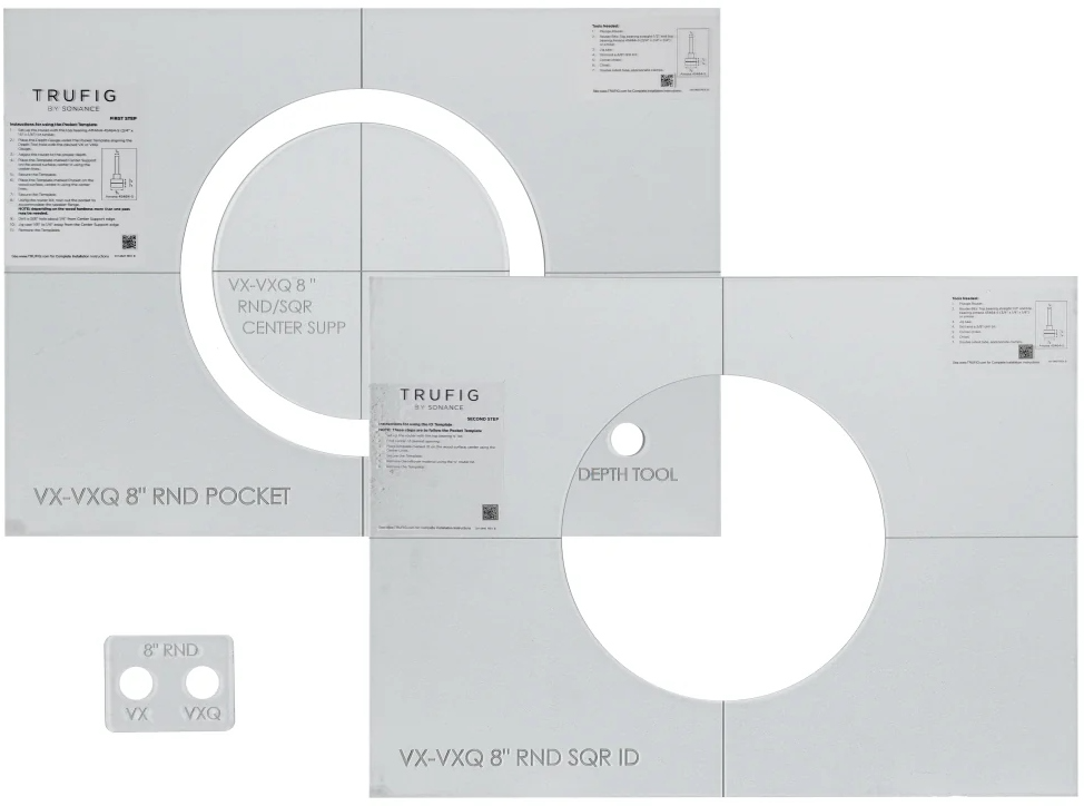 These TRUFIG router templates enable precision flush installations of 8" round Sonance VX/VXQ speakers into solid surfaces. The four-piece kit includes pocket template, depth gauge, center support, and Speaker ID template for accurate routing of trimless grille dimensions and speaker cutouts, ensuring perfect flush mounting.Read More